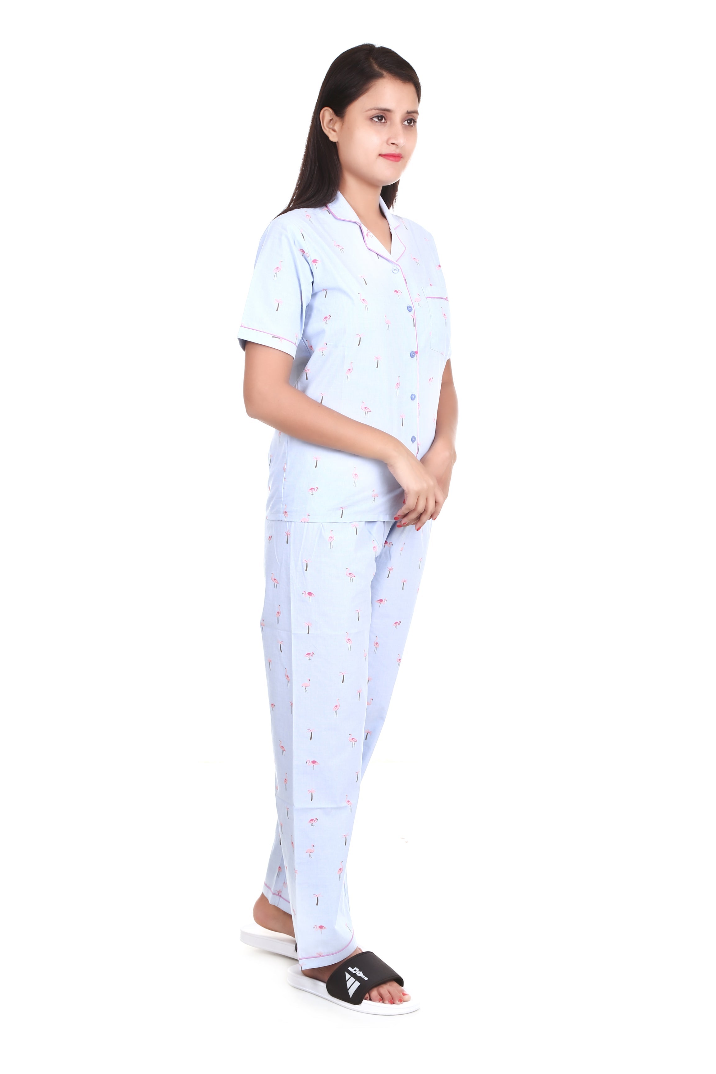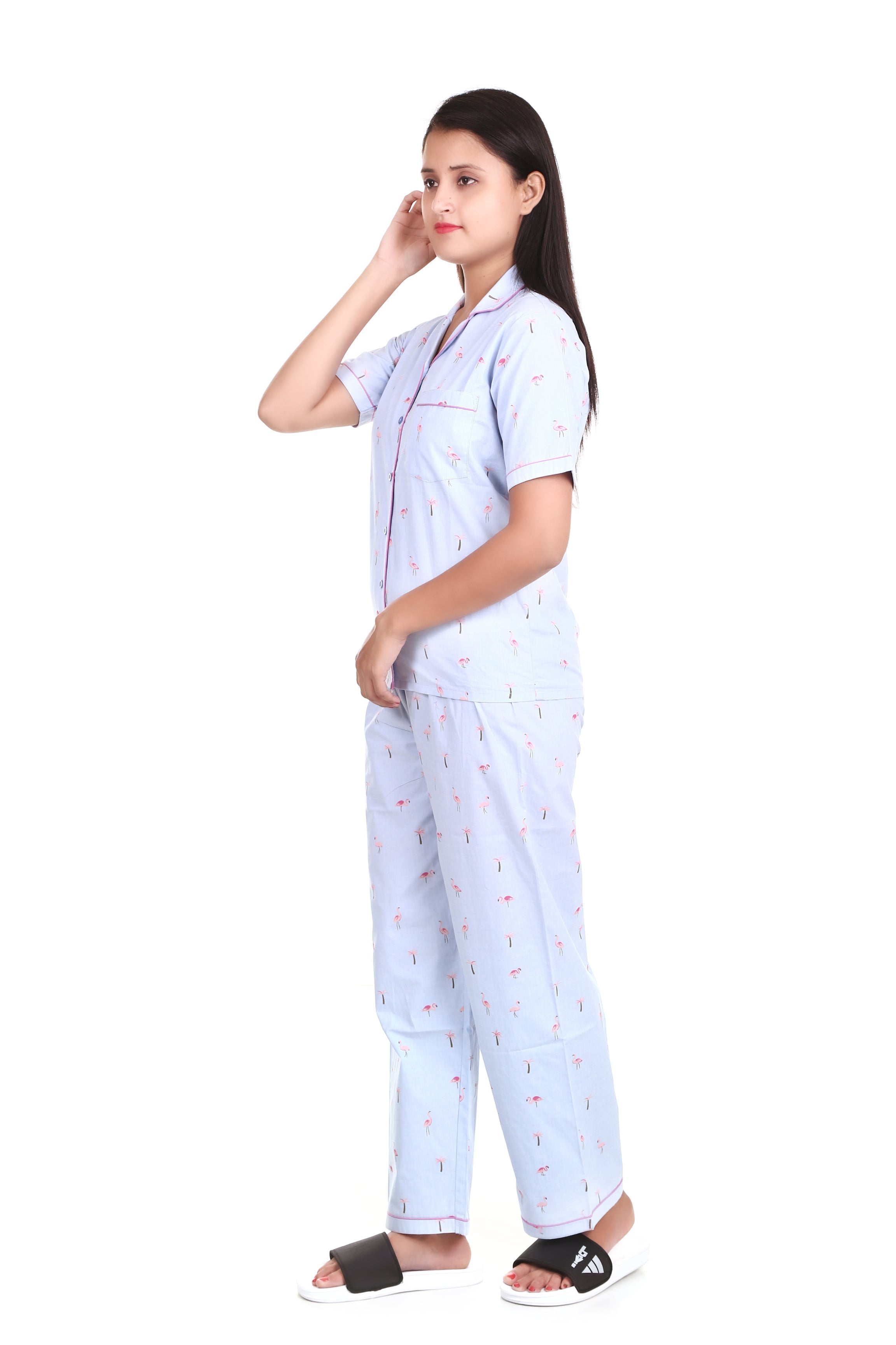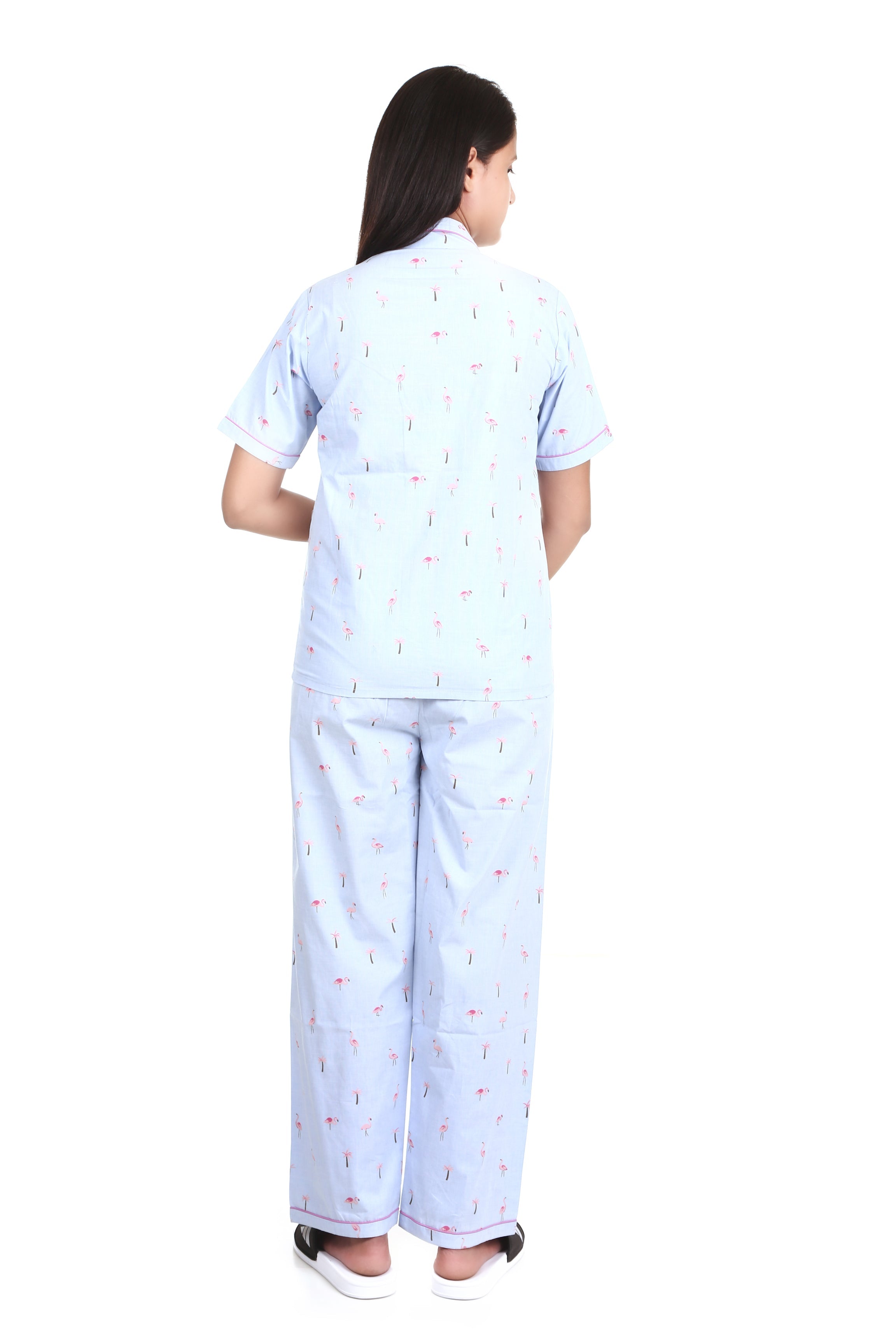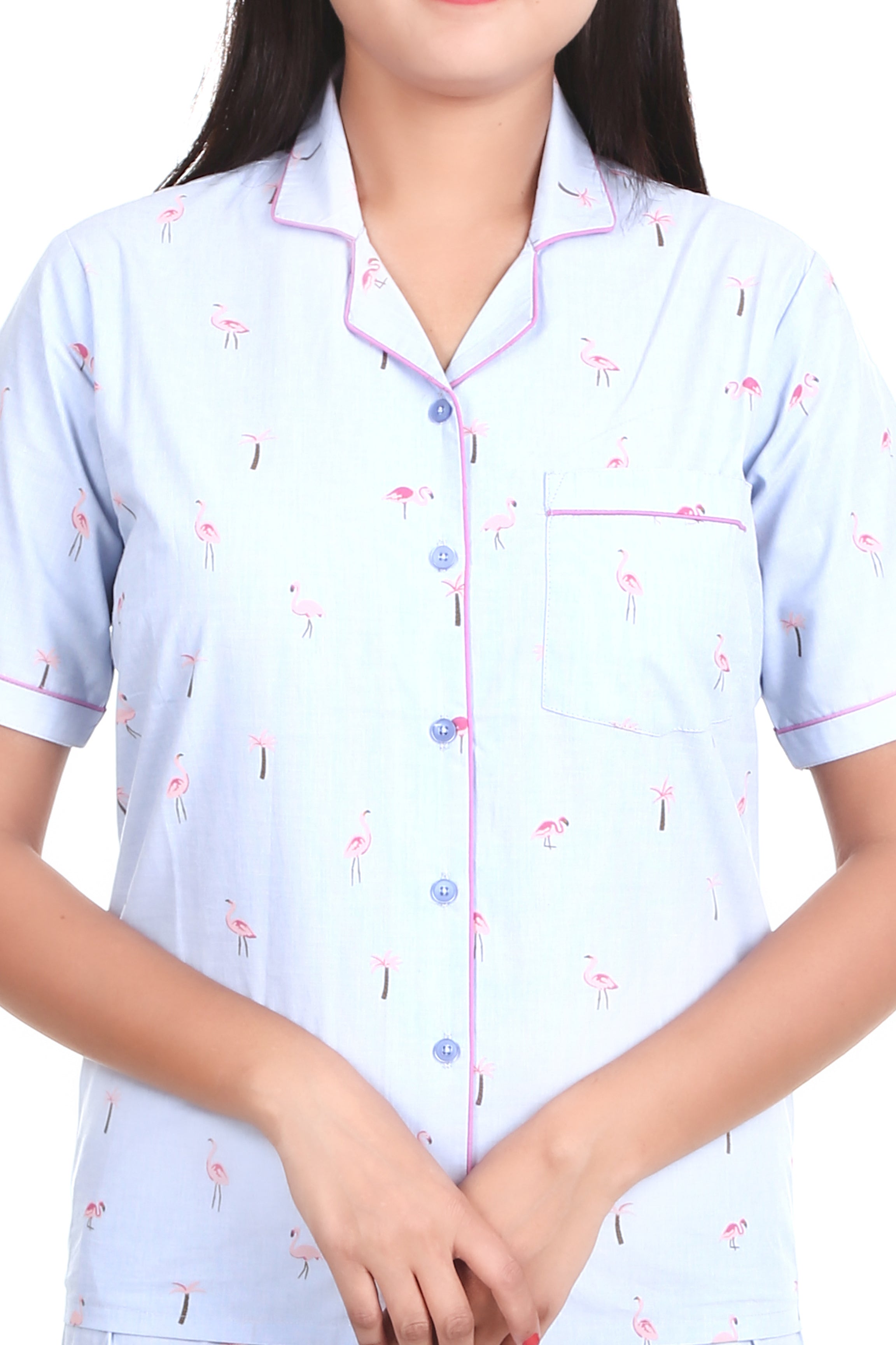 Blue Flamingo Print Short Sleeves Night Suit For Women’s