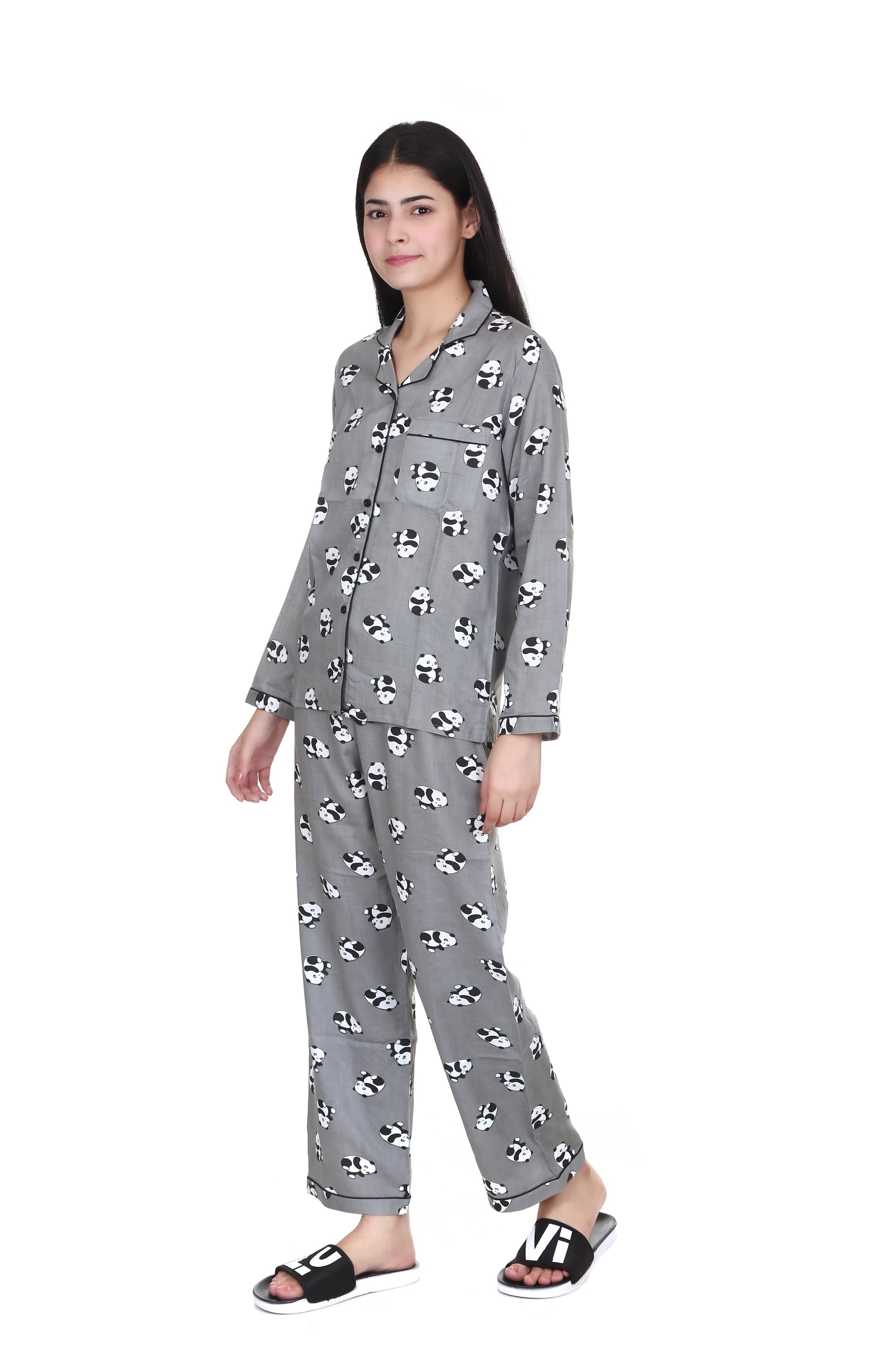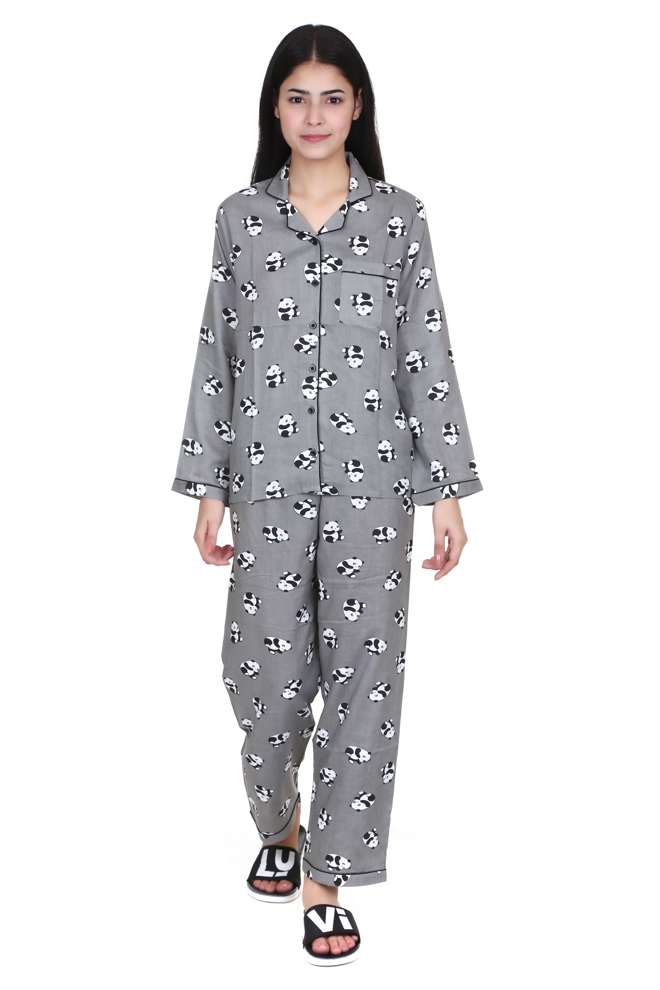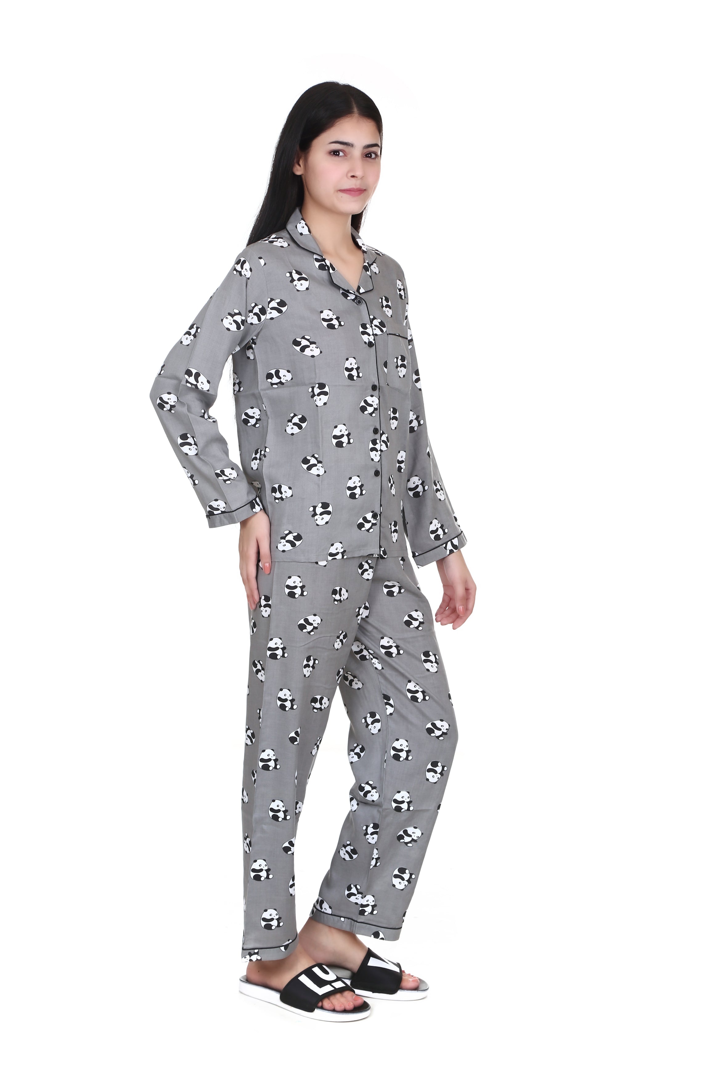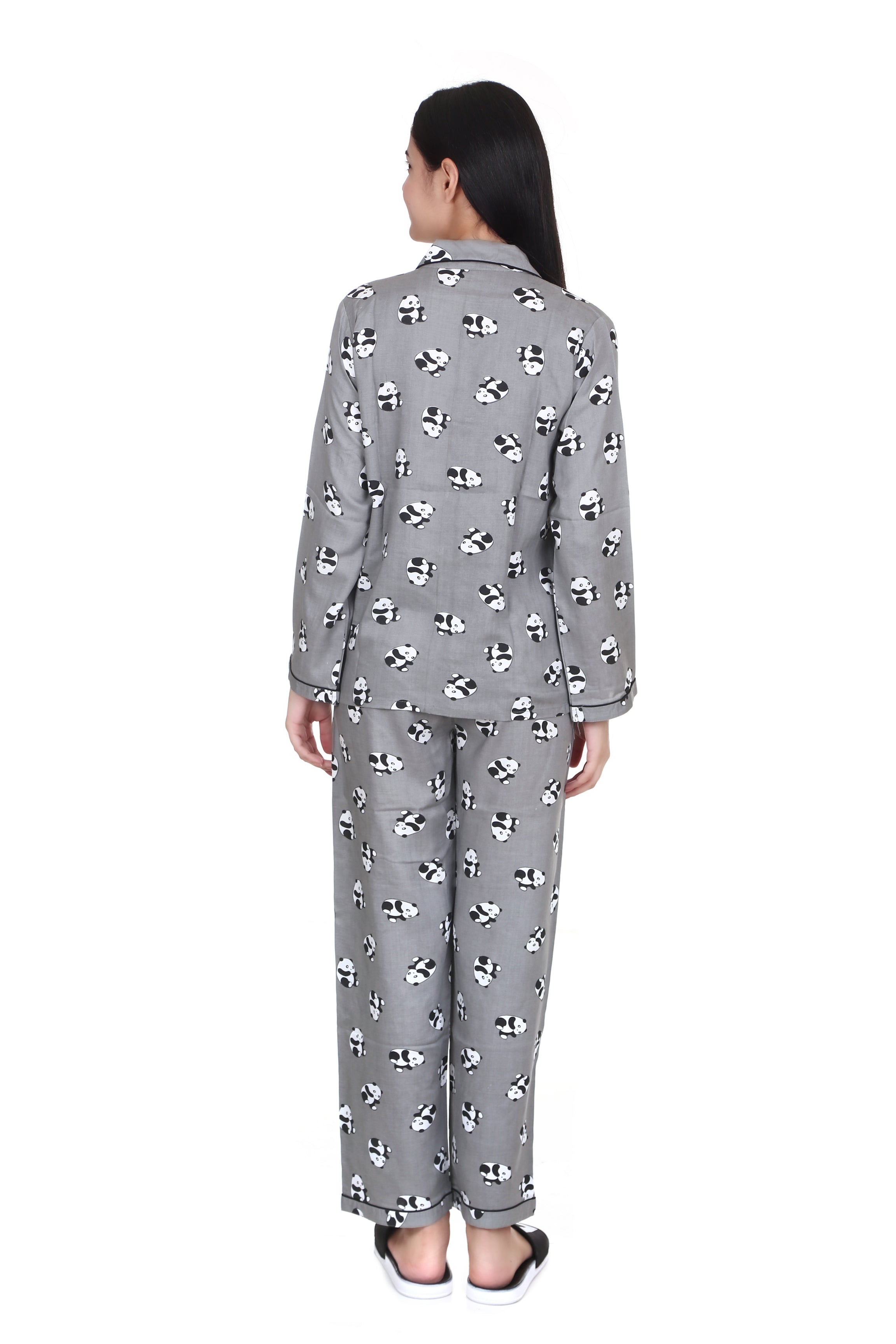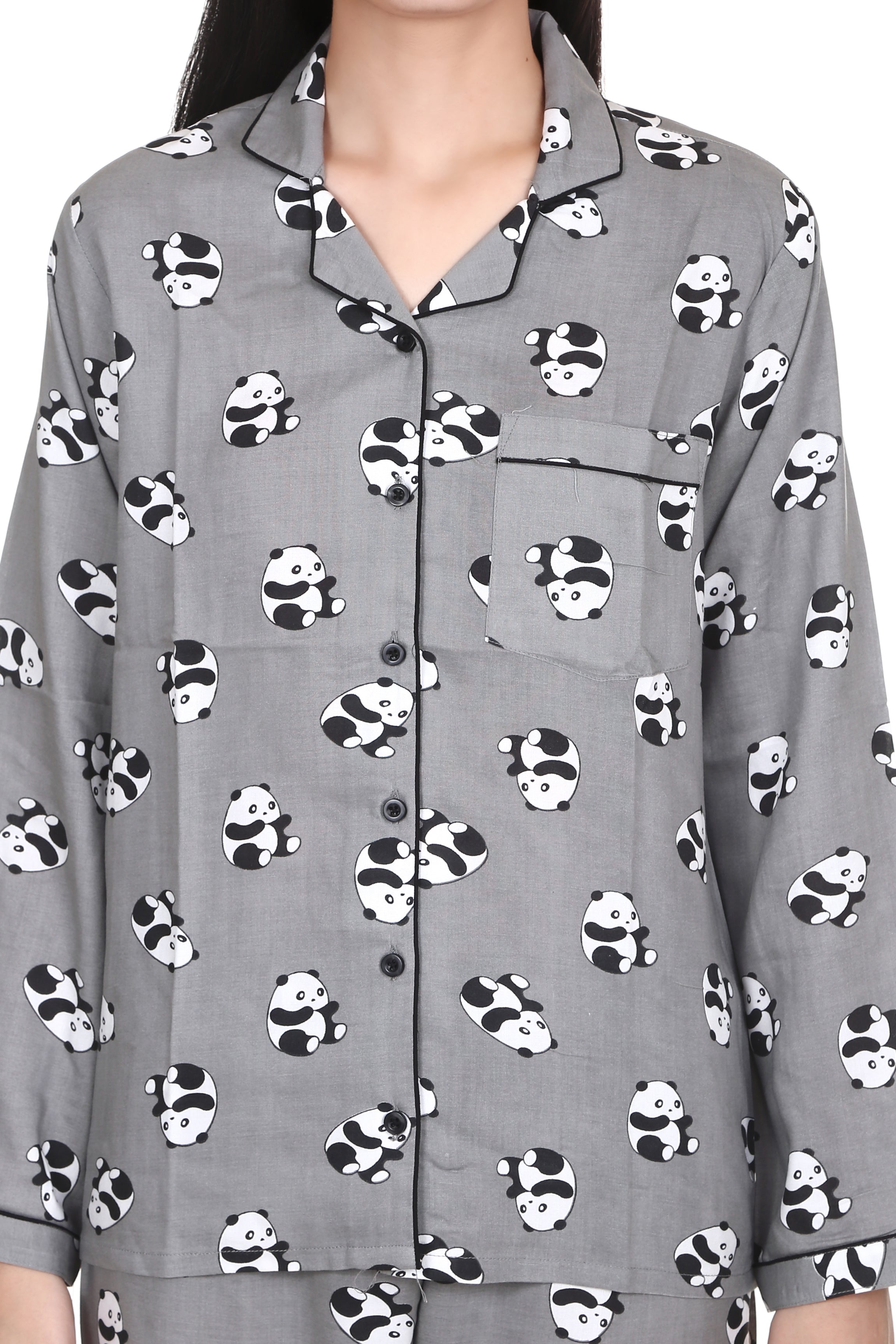 Grey Panda Print Full Sleeves Rayon Night Suit for Women