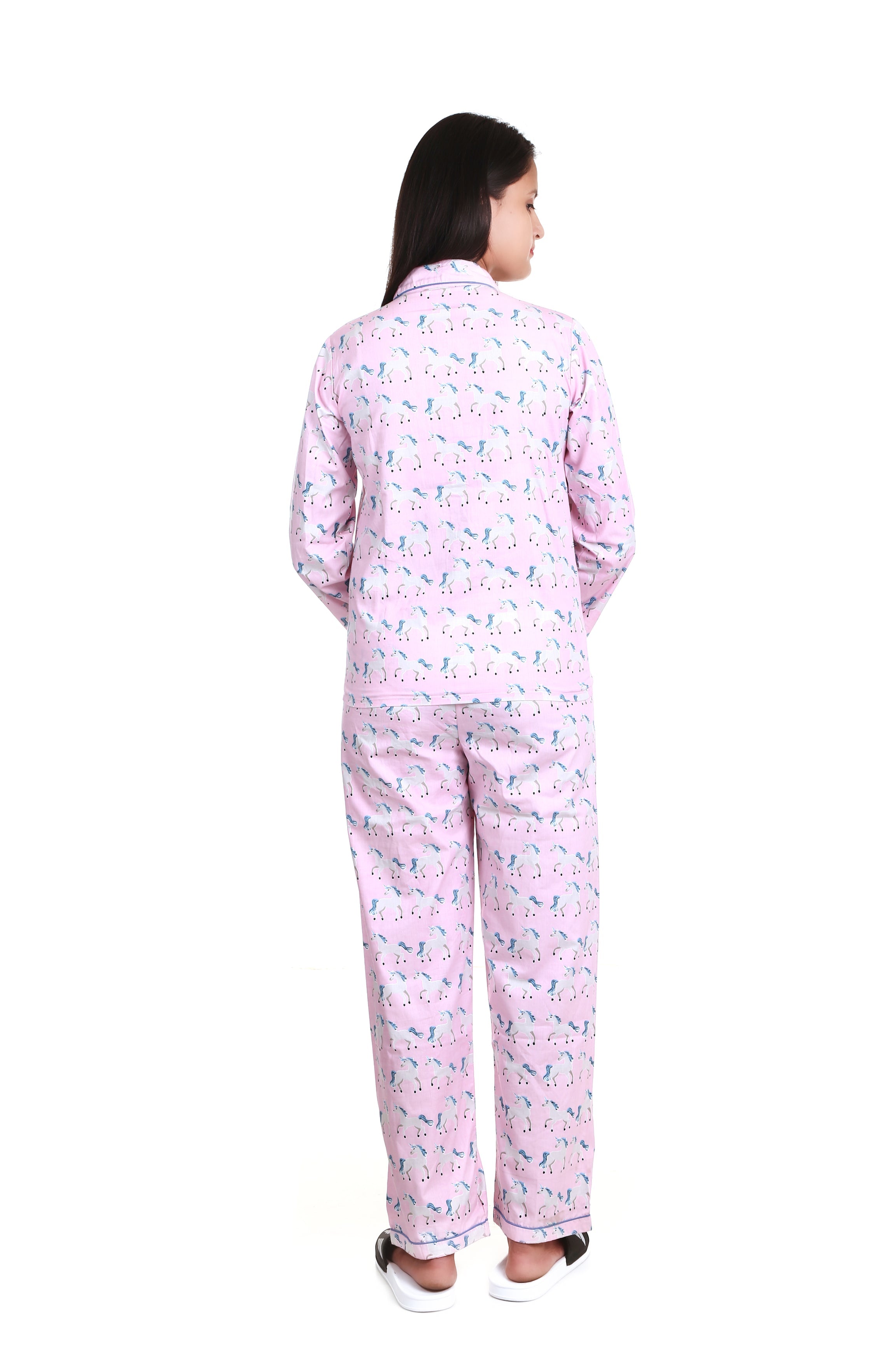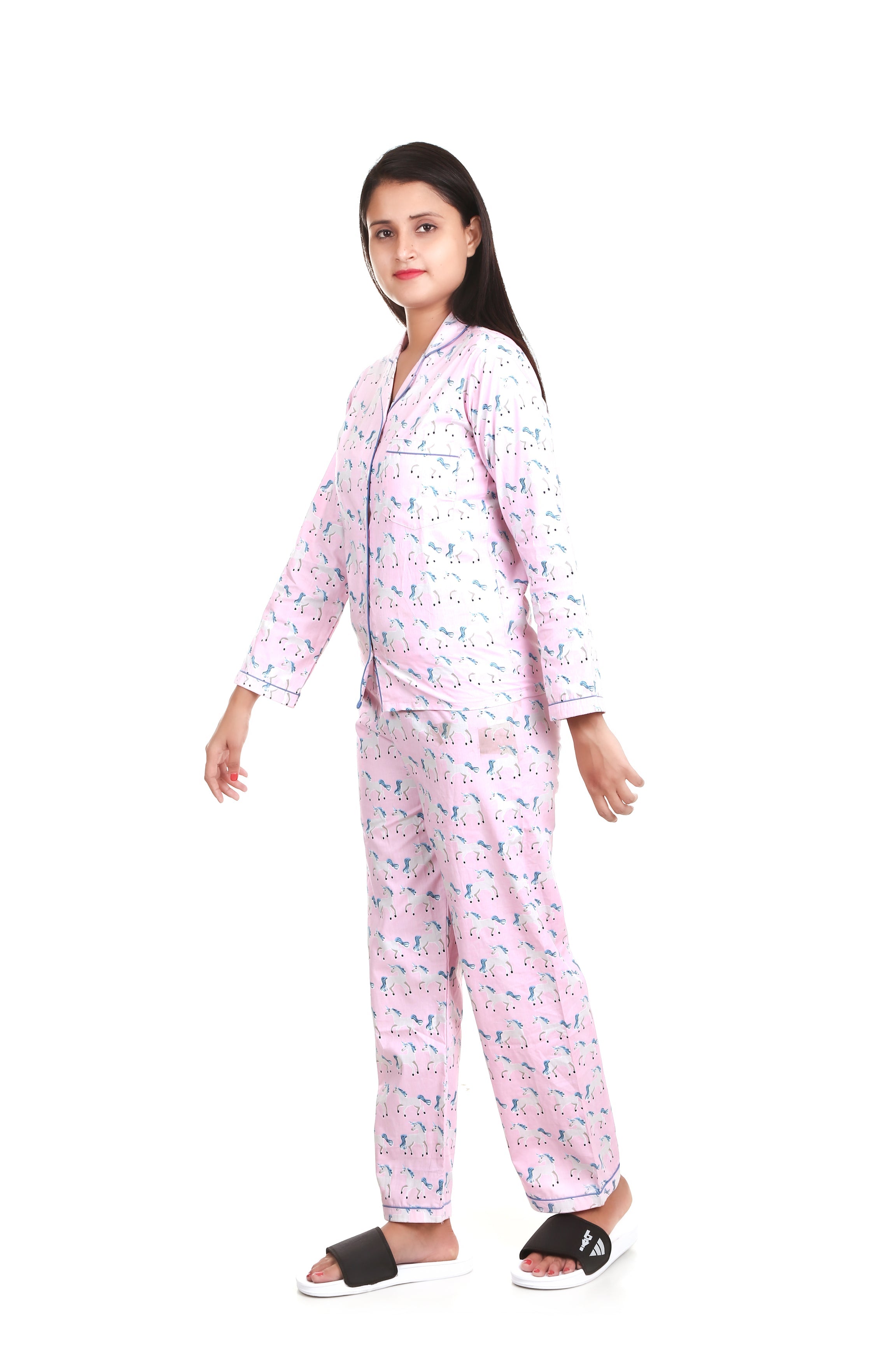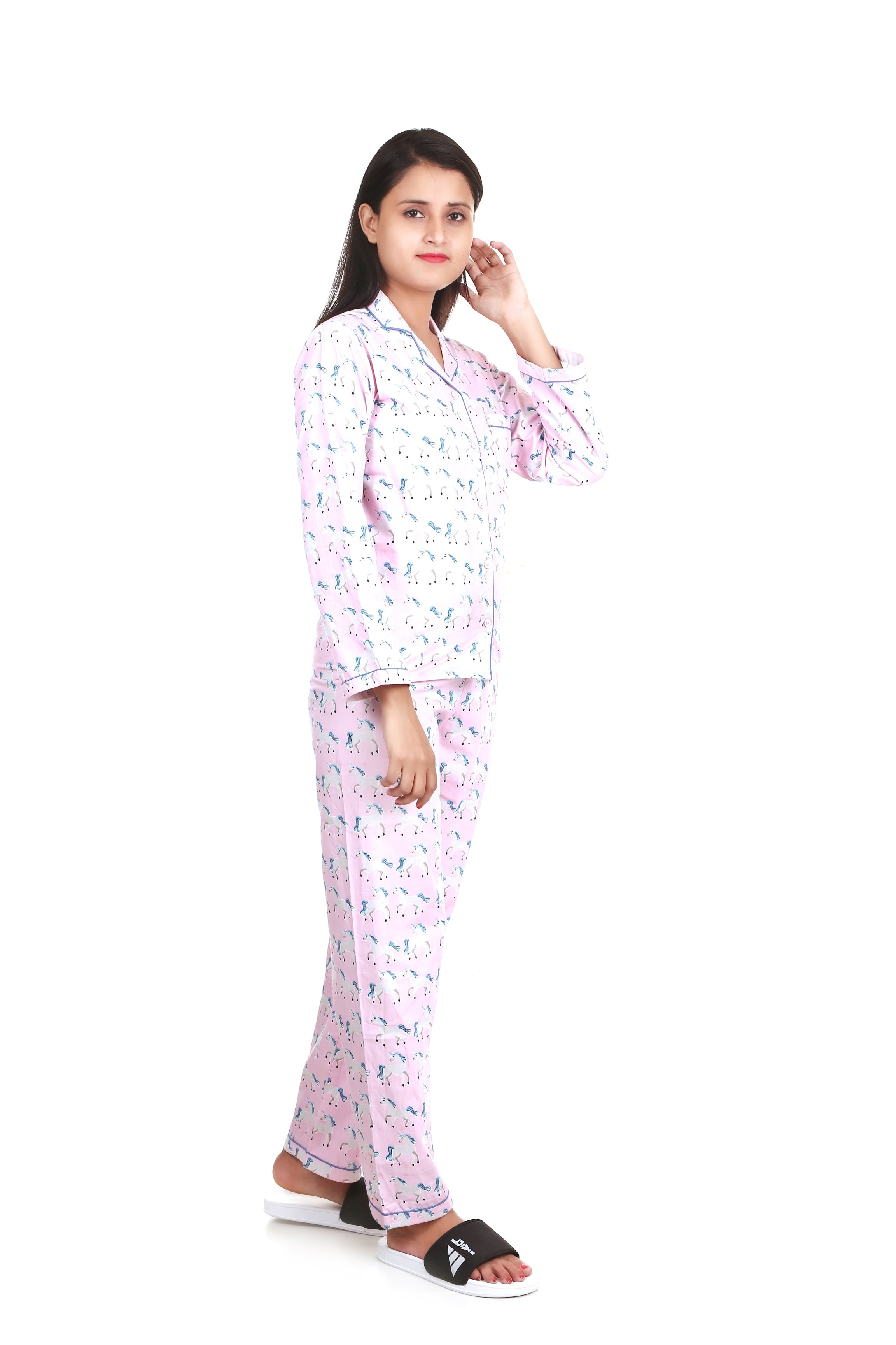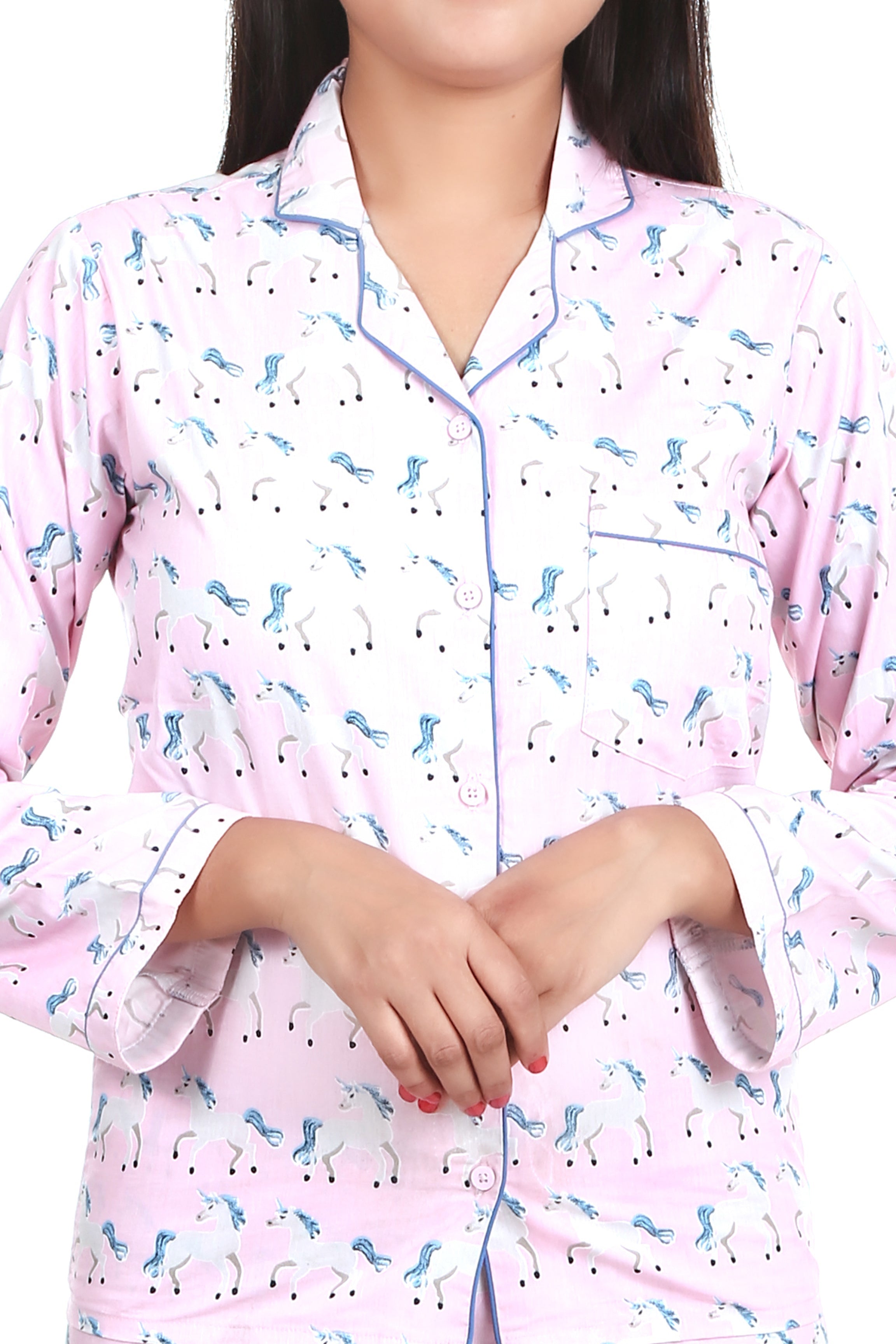 Pink Unicorn Print Long Sleeves Night Suit For Women’s
