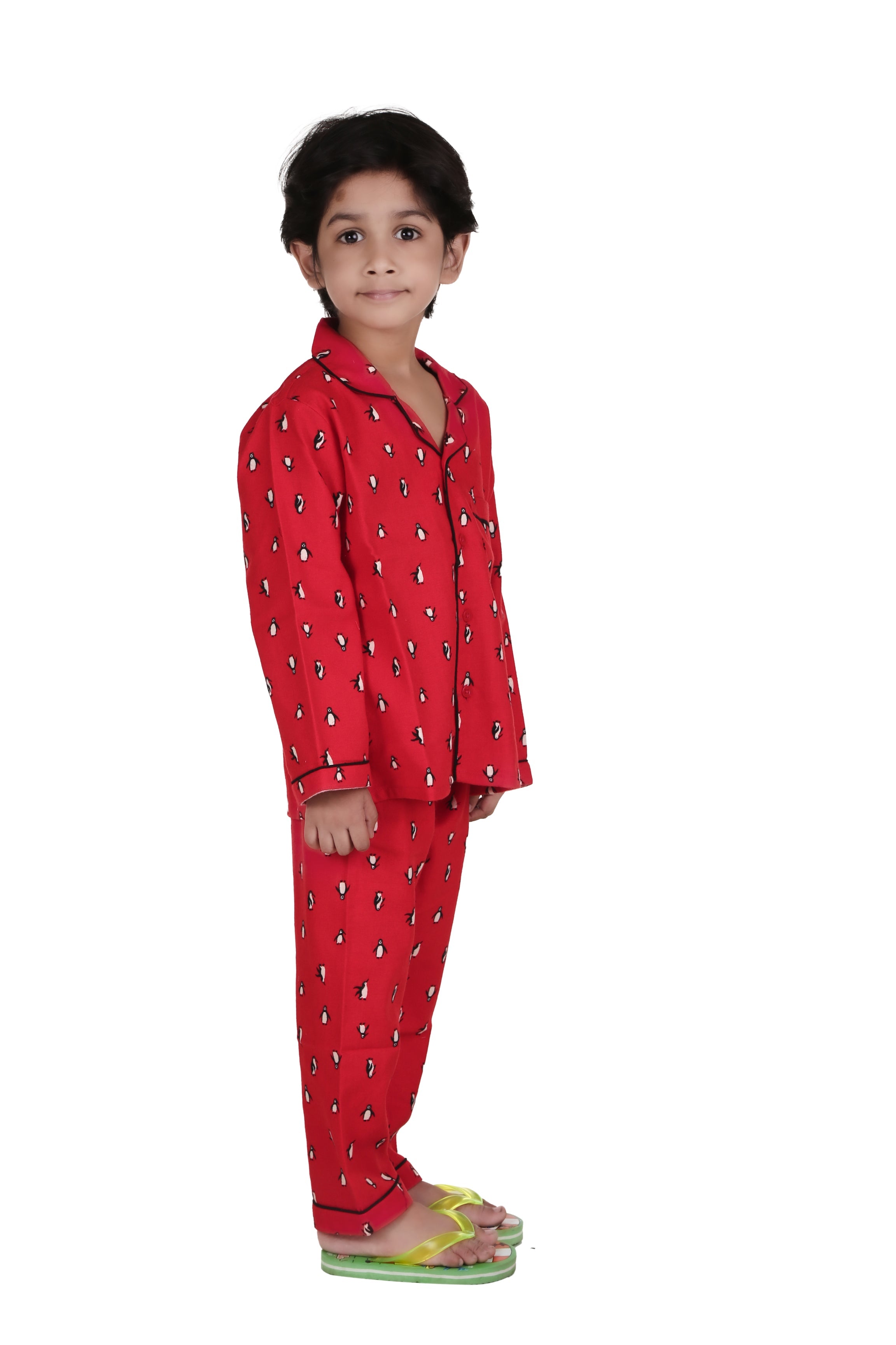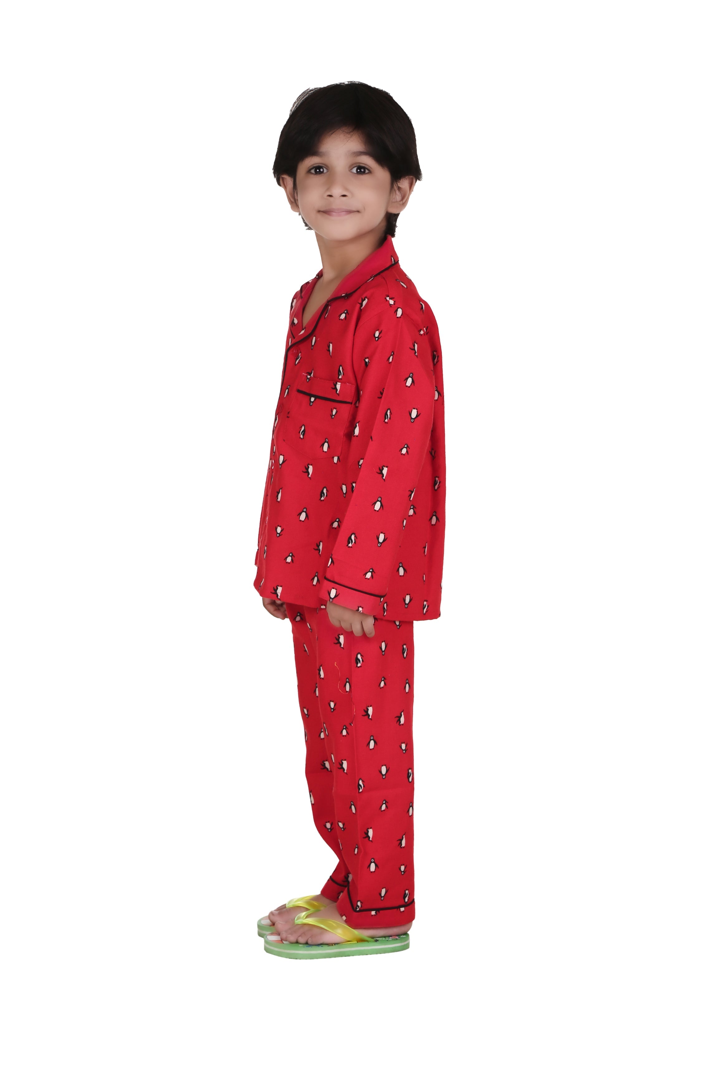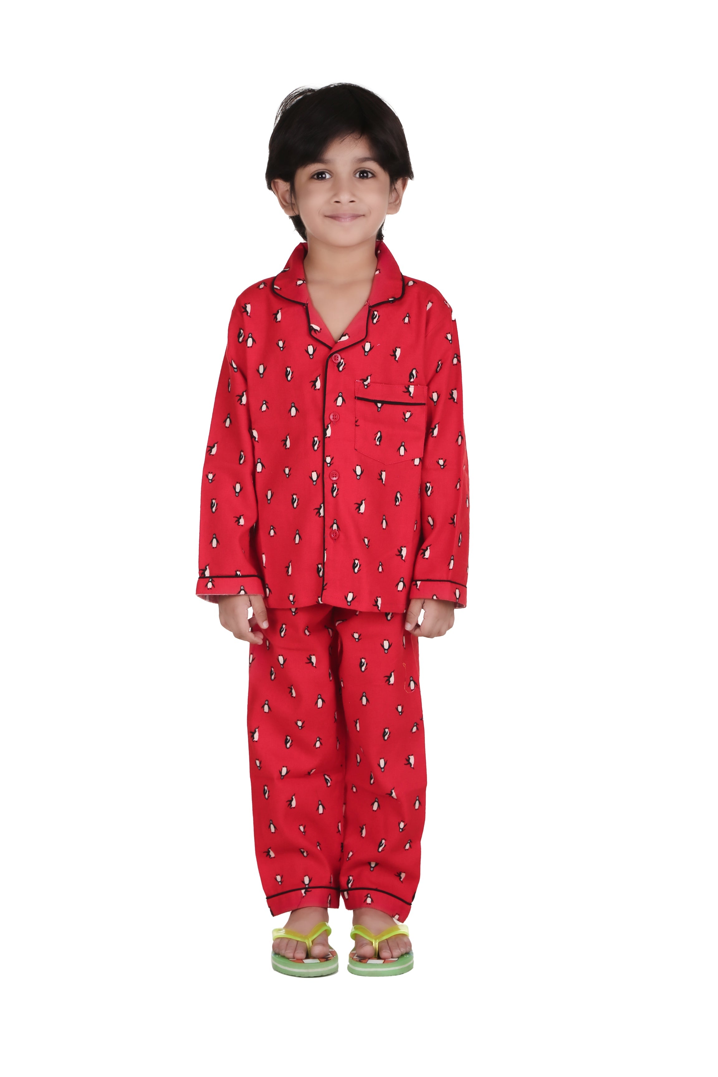 Red Penguin Print Full Sleeves Night Suit for Kids