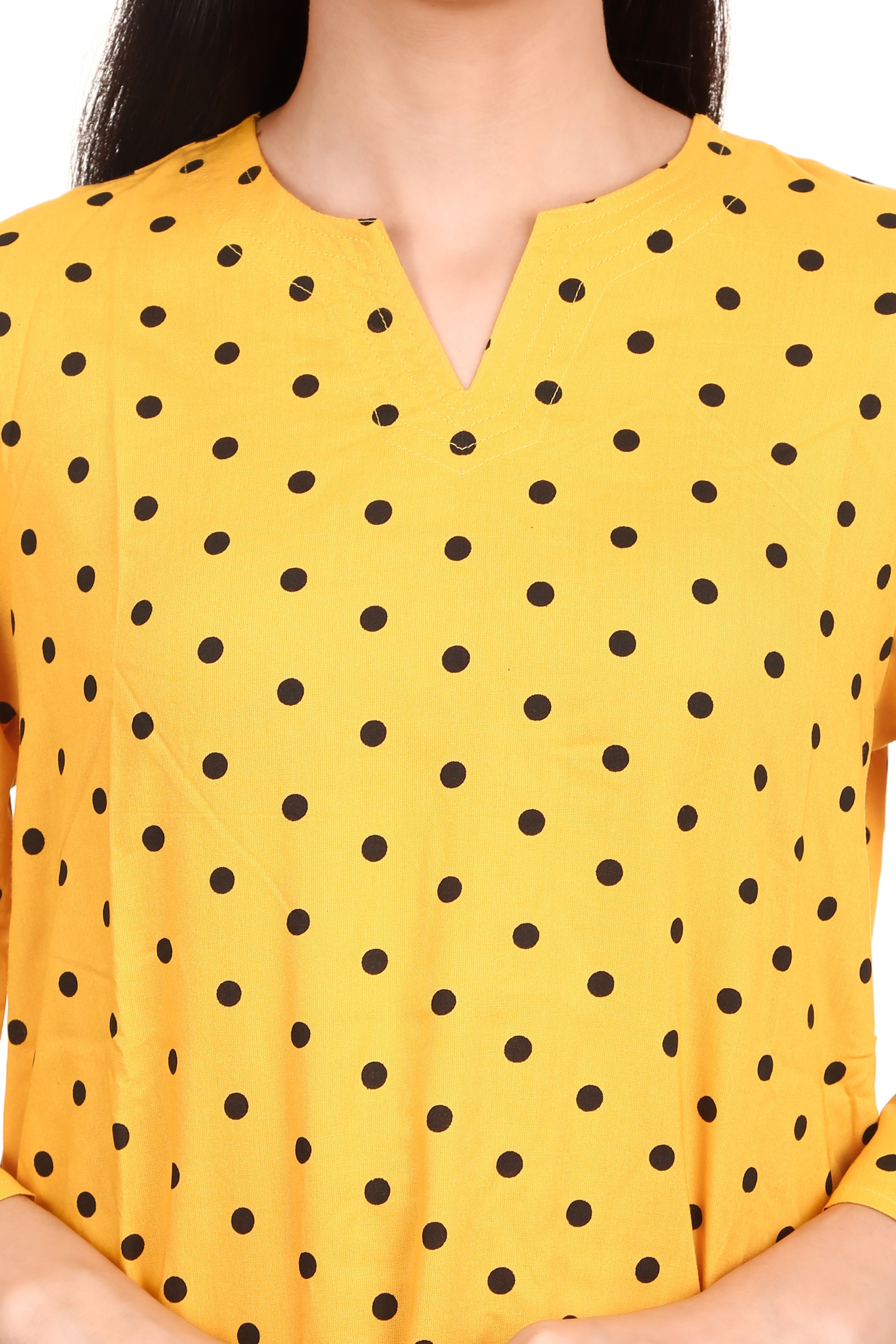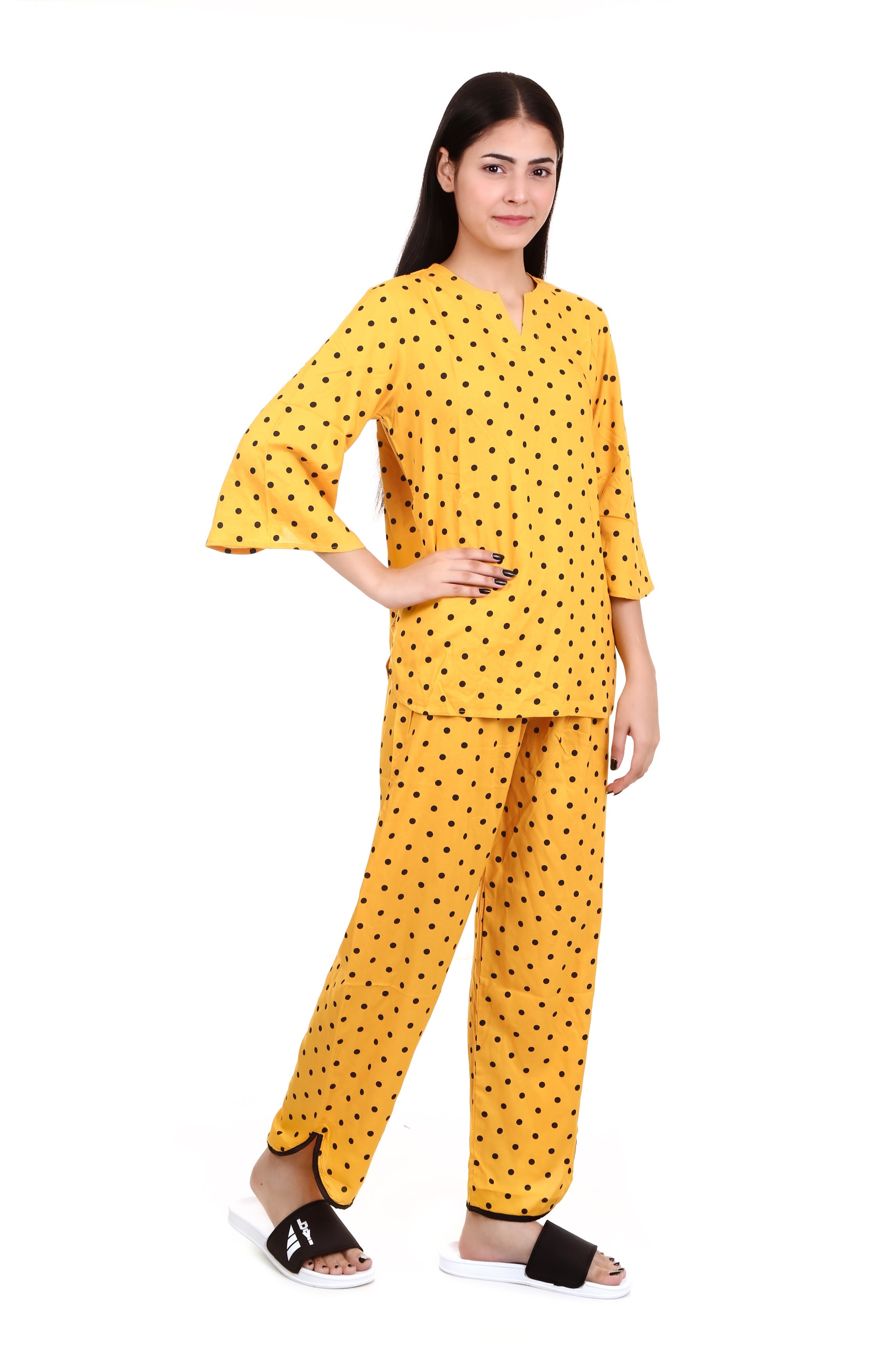 Be the first to review “Yellow Dot Print V Neck And V Cut Pajama Night Suit For Women’s”